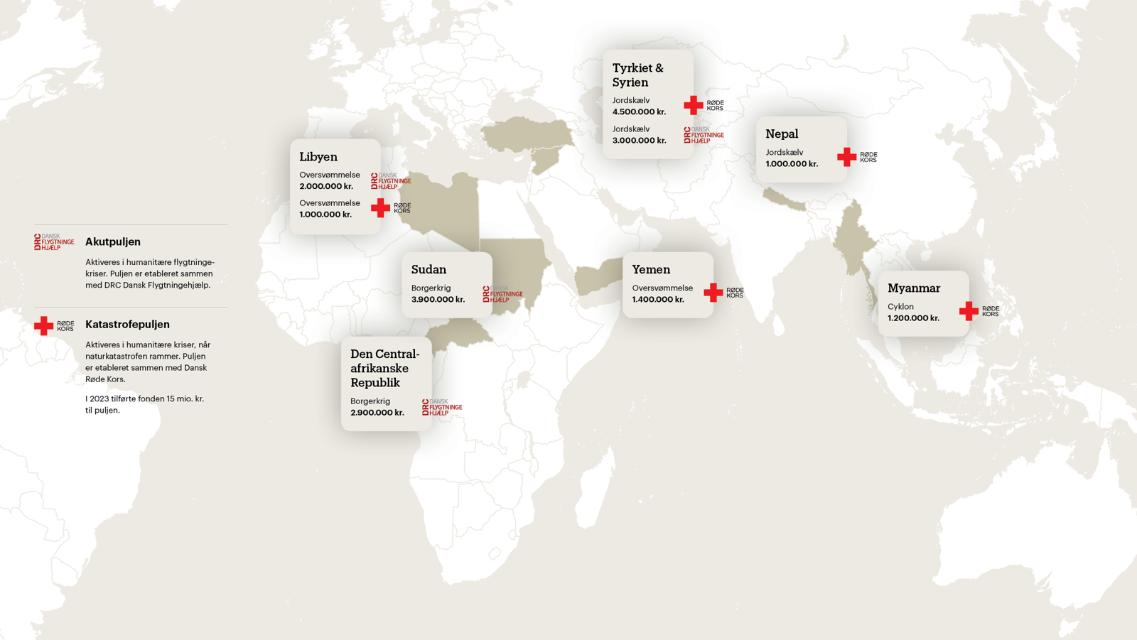 I 2023 støttede vi 9 humanitære indsatser rundt om i verden gennem vores to puljesamarbejder med Dansk Flygtningehjælp og Røde Kors. Derudover har vi støttet med ekstra nødhjælp til den ukrainske befolkning samt ekstra humanitær støtte til Mellemøsten i kølvandet på den eskalerende konflikt mellem Israel og Hamas.
