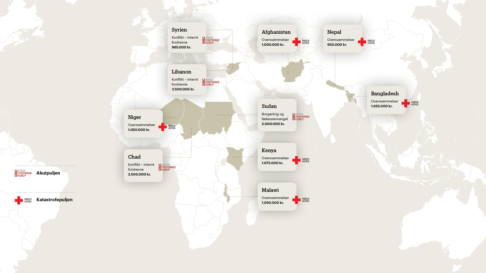 I 2024 støttede vi 10 humanitære indsatser rundt om i verden gennem vores to puljesamarbejder med Dansk Flygtningehjælp og Røde Kors.